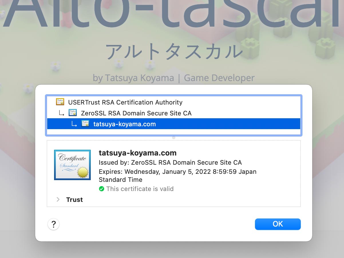 • 以下のように ZeroSSL という表記があれば ZeroSSL で認証できています: