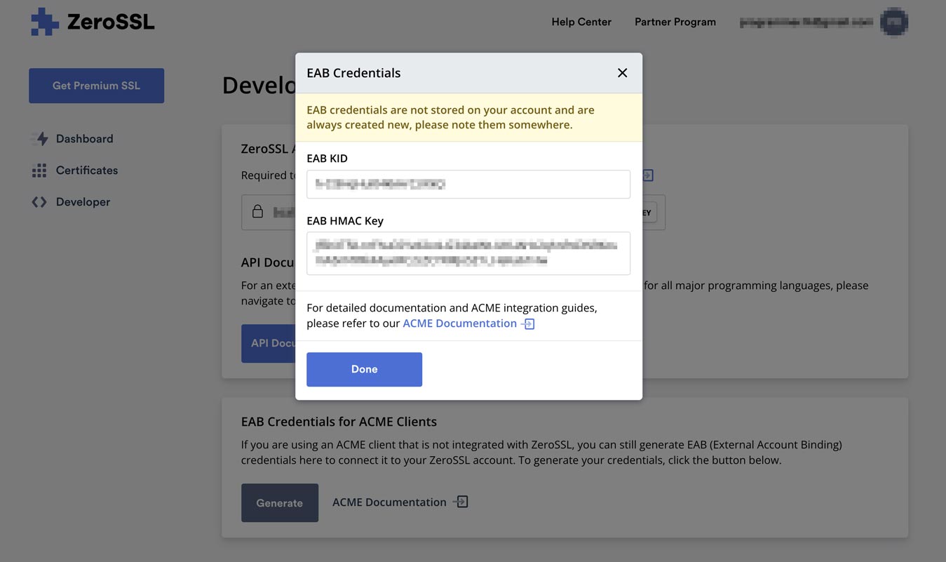 • ZeroSSL のサイトにログインし、Developer の項目で EAB Credentials for ACME Clients の Generate ボタンを押します