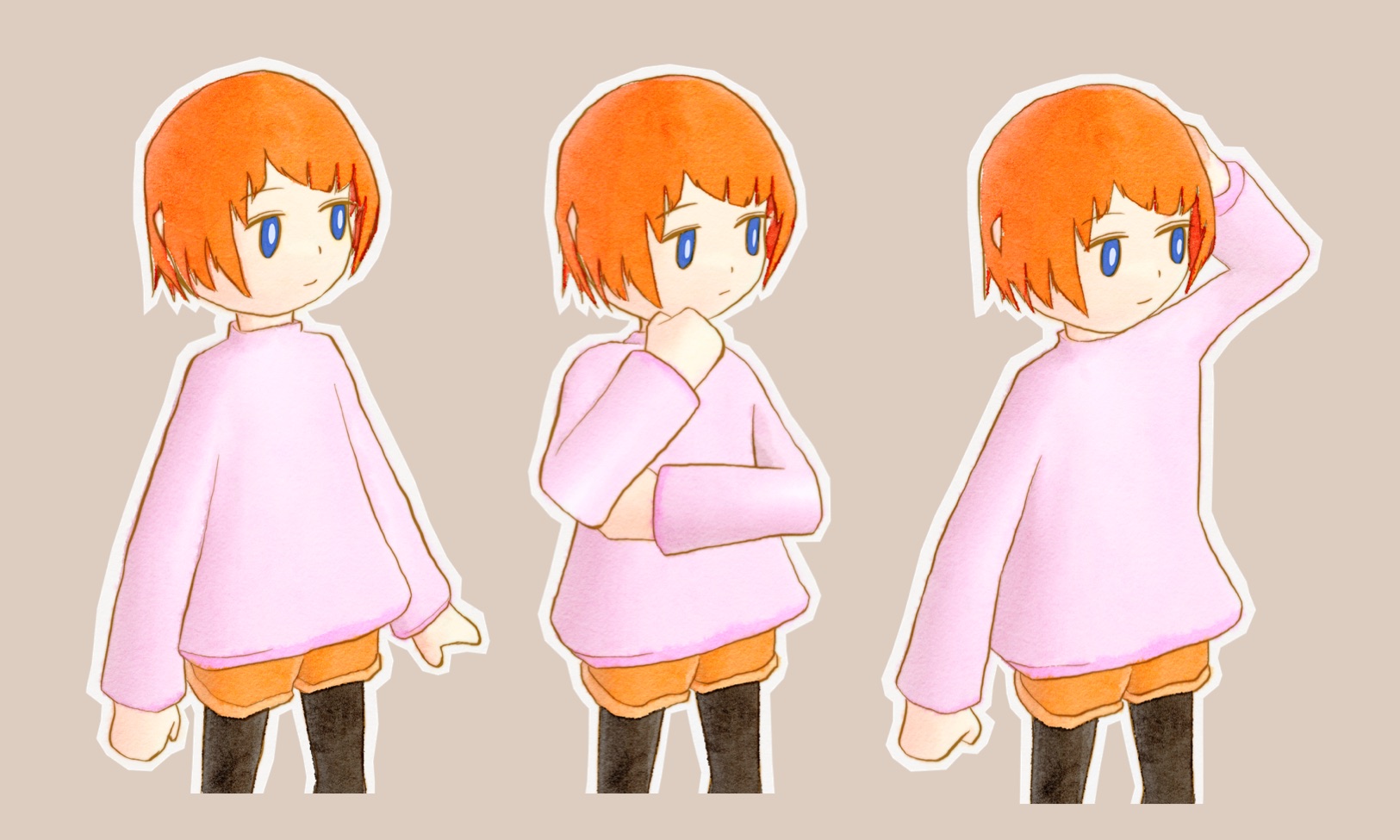 女の子側のカラーとのバランスをとるために服をピンクっぽくしたのが余計に女の子っぽく見せている気がする。 まあ実際、「ちょっとぼーっとしてて中性的な感じ」をイメージしていて、 Blender でモデリングする時は横に 「Undertale の主人公」で検索した画像 を横に置いてそれを見ながらやっていたので、 そういう見た目になったのもある意味狙い通りなのかもしれない。