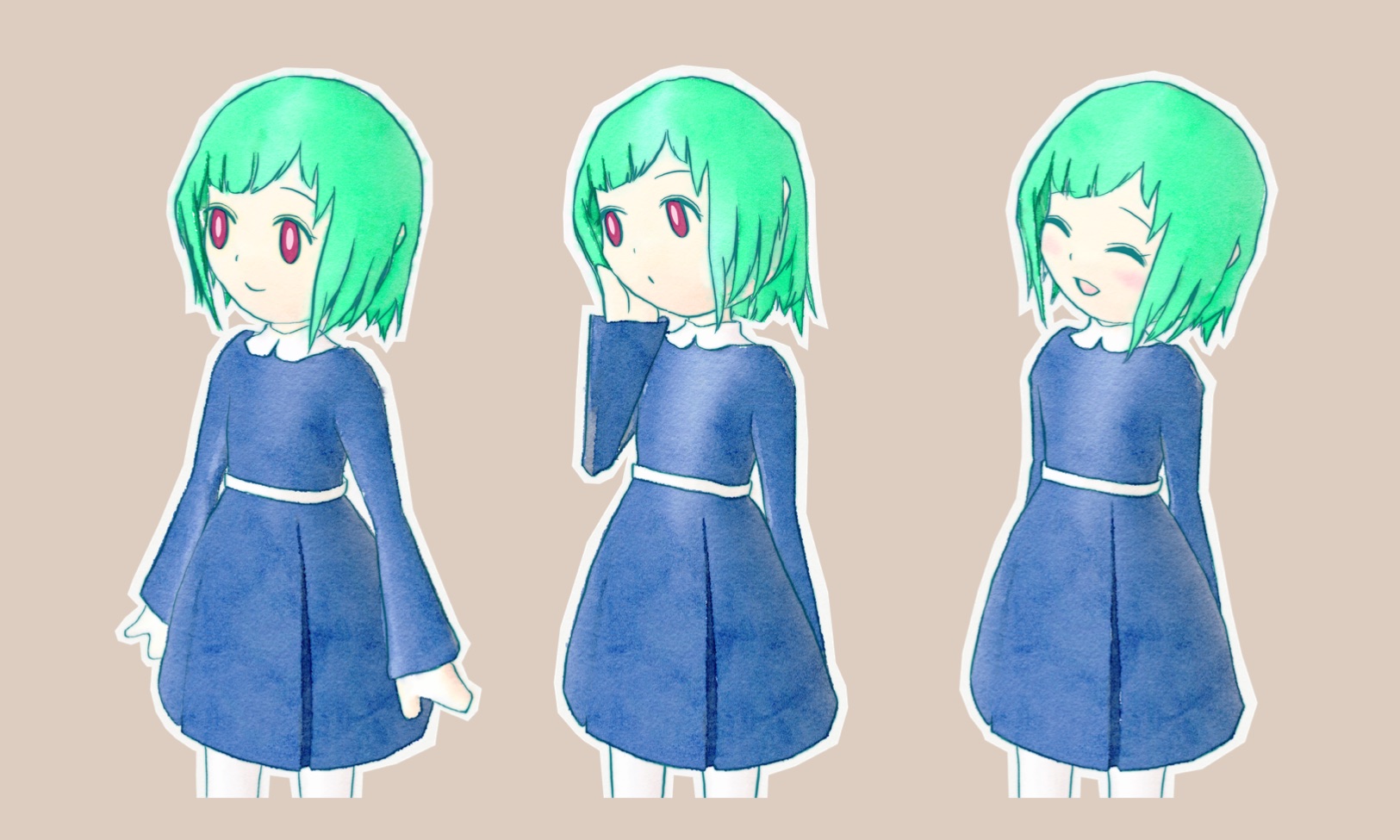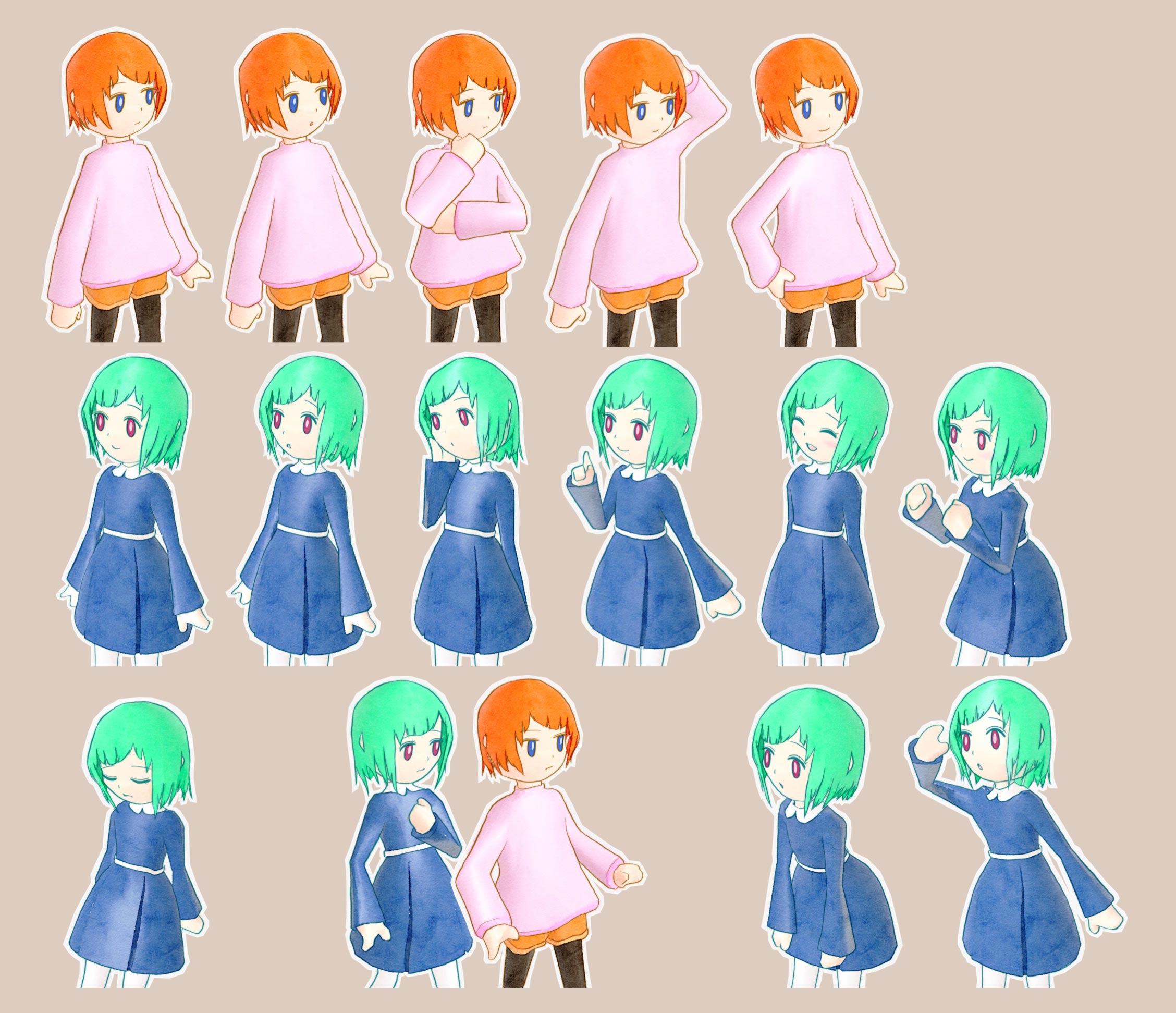 男の子のほうを操作プレイヤーにして、口数少なめのキャラにしようと考えている。 代わりに女の子の方は表情豊かで動きのある、プレイヤーを導く役回りにしたい。