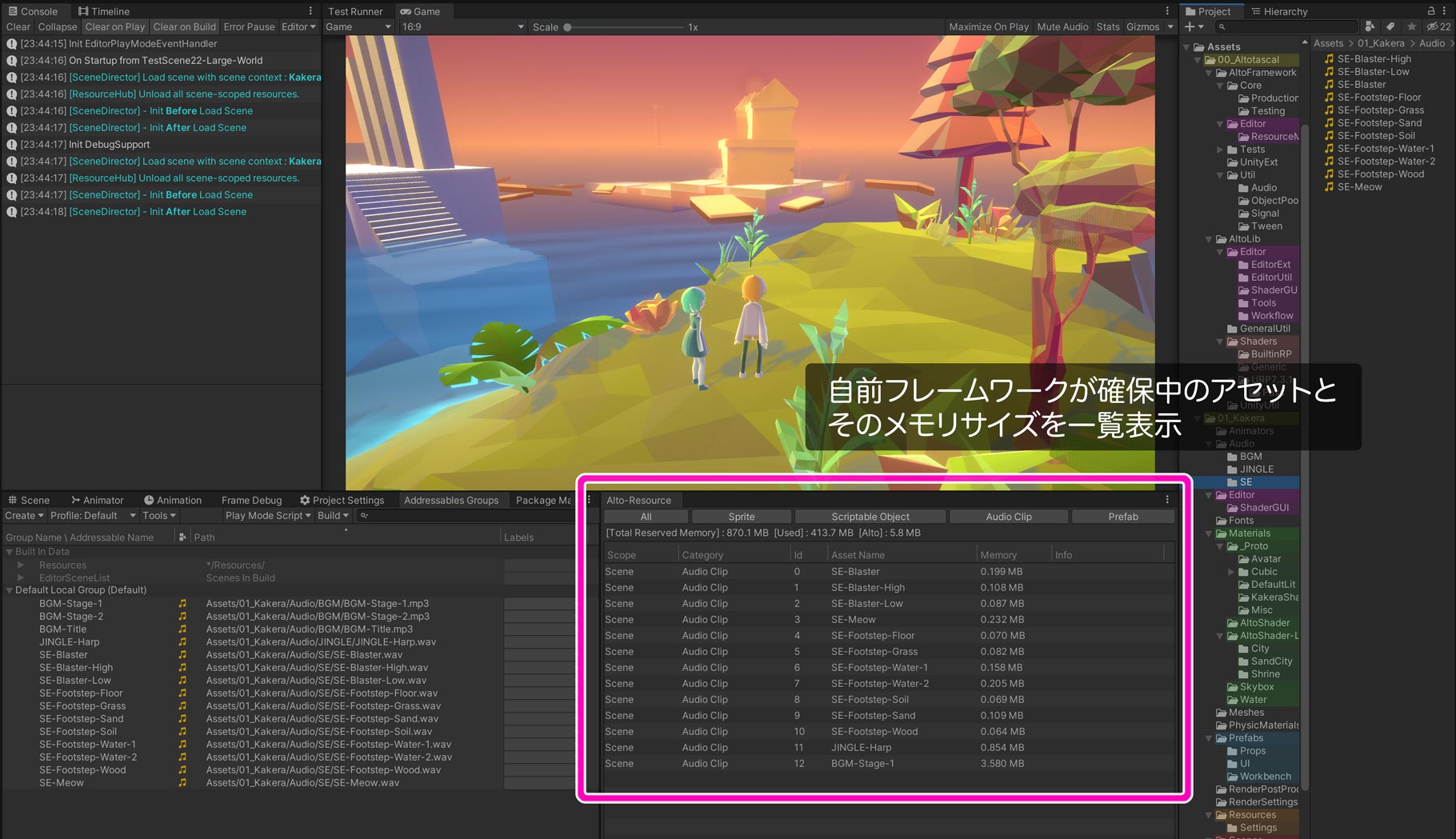 こだわりポイントとして、自前フレームワークが管理しているリソースをモニターできるウインドウを用意している。 これで、現在どれくらいのアセットをメモリに確保しているかが目視確認できる:
