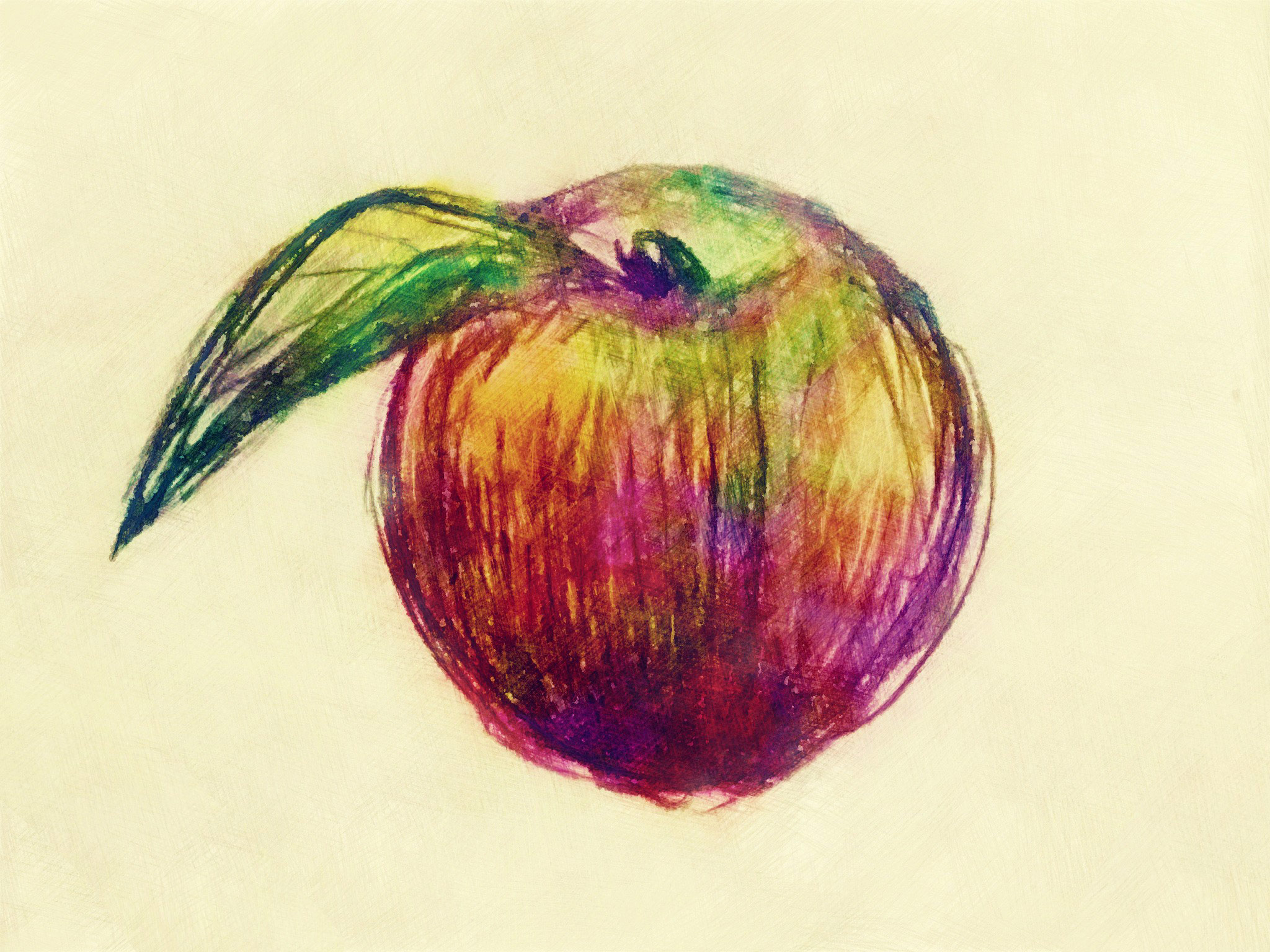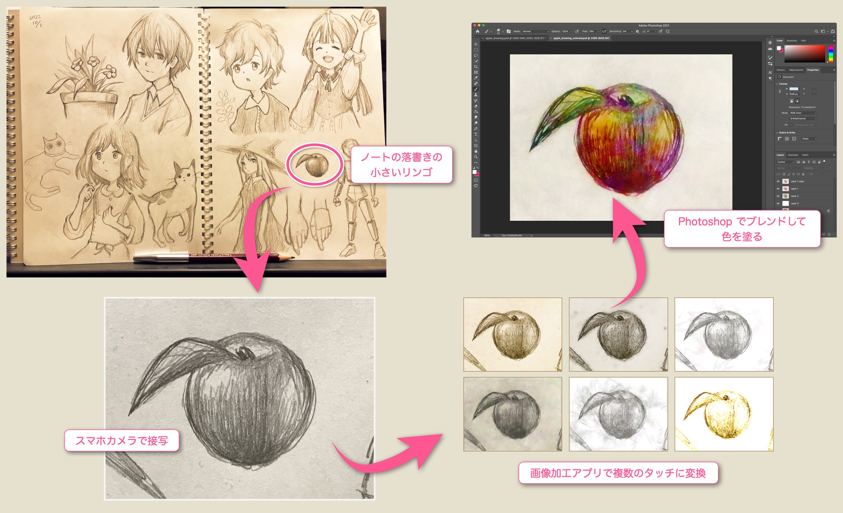 - ノートの落書きの小さいリンゴをスマホカメラで接写して、画像加工アプリで複数のタッチに変換したものを Photoshop でブレンドして色を塗ってみる